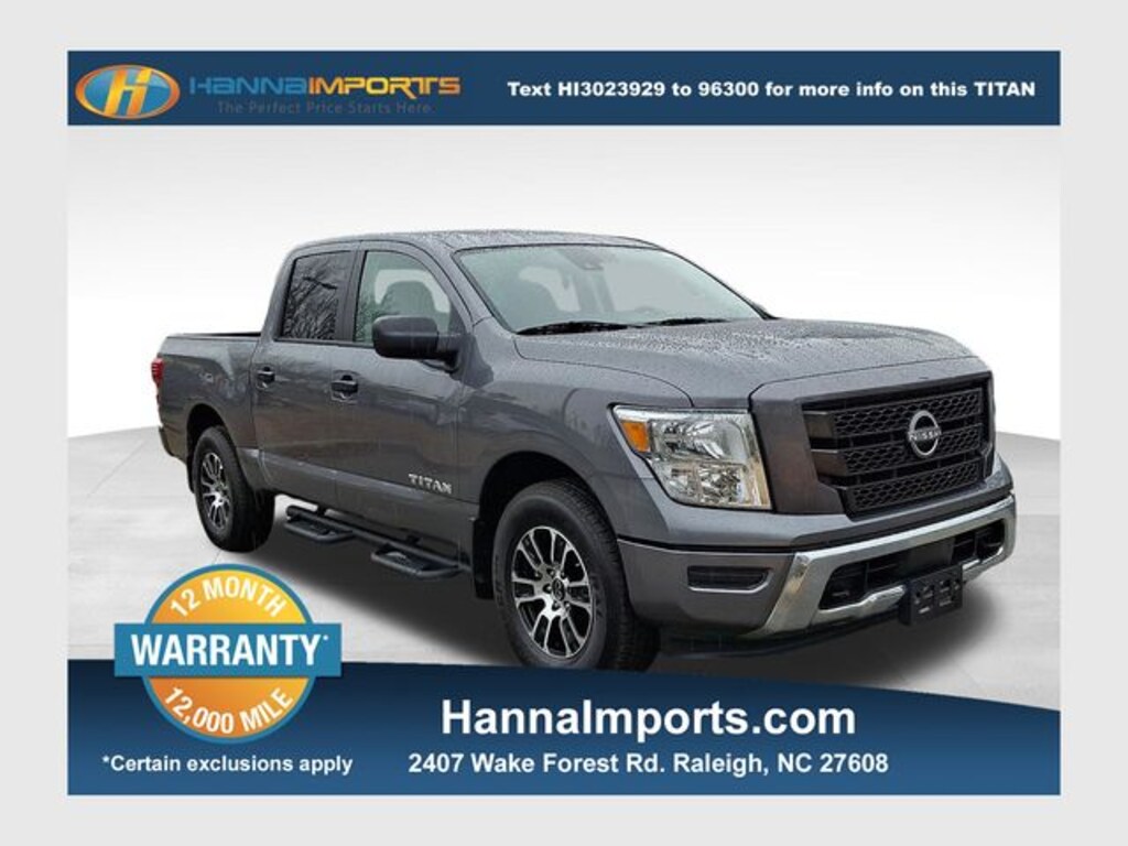 Why shop with Hanna Imports? We specialize in hand-selecting top-quality used cars, trucks, and SUVs for drivers across Raleigh, Durham, Cary, Chapel Hill, and the greater Triangle area of North Carolina. Our massive selection of 1,000+ vehicles on our Raleigh lot is carefully curated to include the most sought-after models, all priced below market value. We believe in transparency and efficiencyâ"our vehicles are aggressively priced from the start, which means no haggling, no hassle, and no wasted time. The price you see is our absolute best price. Whether you're coming from Wake Forest, Apex, Garner, or anywhere in central NC, weâre committed to making your car-buying experience smooth, affordable, and enjoyable. Come see why Hanna Imports is one of the most trusted used car dealerships in North Carolina! Used Nissan Titan in Raleigh. Used Nissan Titan in North Carolina, Accessory Utility Package (Bumper Step, Drop In Bed Liner, and Trailer Hitch), Titan SV, 4WD, Apple CarPlay/Android Auto, Blind Spot Warning, Rear Parking Sensors, Remote keyless entry, 3.692 Axle Ratio, 4-Wheel Disc Brakes, 6 Speakers, ABS brakes, Air Conditioning, Alloy wheels, AM/FM radio: SiriusXM, Auto High-beam Headlights, Brake assist, Bumpers: chrome, Carpet Floor Mats, Cloth Seat Trim, Driver door bin, Dual front impact airbags, Dual front side impact airbags, Electronic Stability Control, Front anti-roll bar, Front Center Armrest w/Storage, Front reading lights, Front Split Bench Seat (40/20/40), Front wheel independent suspension, Fully automatic headlights, Heated door mirrors, Illuminated entry, Knee airbag, Loop Side Steps, Low tire pressure warning, Occupant sensing airbag, Outside temperature display, Overhead airbag, Overhead console, Panic alarm, Passenger door bin, Passenger vanity mirror, Power door mirrors, Power steering, Power windows, Radio data system, Radio: AM/FM Audio System, Rear anti-roll bar, Rear reading lights, Rear seat center armrest, Rear step bumper, Rear window defroster, Security system, Speed control, Speed-sensing steering, Speed-Sensitive Wipers, Splash Guards, Split folding rear seat, Steering wheel mounted audio controls, Tachometer, Telescoping steering wheel, Tilt steering wheel, Traction control, Trip computer, Variably intermittent wipers, Voltmeter, and Wheels: 18" x 8" Painted & Machined Alloy.