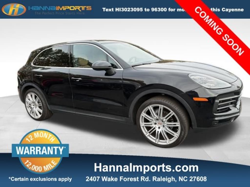 Why shop with Hanna Imports? We specialize in hand-selecting top-quality used cars, trucks, and SUVs for drivers across Raleigh, Durham, Cary, Chapel Hill, and the greater Triangle area of North Carolina. Our massive selection of 1,000+ vehicles on our Raleigh lot is carefully curated to include the most sought-after models, all priced below market value. We believe in transparency and efficiencyâ"our vehicles are aggressively priced from the start, which means no haggling, no hassle, and no wasted time. The price you see is our absolute best price. Whether you're coming from Wake Forest, Apex, Garner, or anywhere in central NC, weâre committed to making your car-buying experience smooth, affordable, and enjoyable. Come see why Hanna Imports is one of the most trusted used car dealerships in North Carolina! Used Porsche Cayenne in Raleigh. Used Porsche Cayenne in North Carolina, 14-Way Power Seats w/Memory Package, Premium Package Plus (4-Zone Climate Control, Ambient Lighting, Automatically Dimming Mirrors, BOSE Surround Sound System, Comfort Access, Front Seat Ventilation, Heated Front & Rear Seats, Heated Front Seats, Lane Change Assist (LCA), LED-Matrix Headlights w/PDLS+, Panoramic Roof System, and Power Steering Plus), AWD, Black/Mojave Beige w/Leather Seat Trim w/Two-Tone, Apple CarPlay, Exterior Parking Camera Rear, Navigation system: Porsche Communication Management (PCM), Power Liftgate, Wheels: 20" Cayenne Sport, 10 Speakers, 4-Wheel Disc Brakes, 8-Way Power Seats, ABS brakes, Adaptive suspension, Air Conditioning, AM/FM radio: SiriusXM, Automatic temperature control, Axle Ratio: TBD, Brake assist, Bumpers: body-color, Delay-off headlights, Driver door bin, Driver vanity mirror, Dual front impact airbags, Dual front side impact airbags, Electronic Stability Control, Four wheel independent suspension, Front anti-roll bar, Front Bucket Seats, Front Center Armrest, Front dual zone A/C, Front reading lights, Fully automatic headlights, Garage door transmitter: HomeLink, Heated door mirrors, Illuminated entry, Knee airbag, Leather Shift Knob, Low tire pressure warning, Occupant sensing airbag, Outside temperature display, Overhead airbag, Overhead console, Panic alarm, Partial Leather Seat Trim, Passenger door bin, Passenger vanity mirror, Porsche Communication Management, Power door mirrors, Power driver seat, Power passenger seat, Power steering, Power windows, Radio data system, Rain sensing wipers, Rear anti-roll bar, Rear fog lights, Rear reading lights, Rear seat center armrest, Rear side impact airbag, Rear window defroster, Rear window wiper, Remote keyless entry, Security system, Speed control, Split folding rear seat, Spoiler, Steering wheel mounted audio controls, Tachometer, Telescoping steering wheel, Tilt steering wheel, Traction control, Trip computer, Turn signal indicator mirrors, Variably intermittent wipers, and Voltmeter.