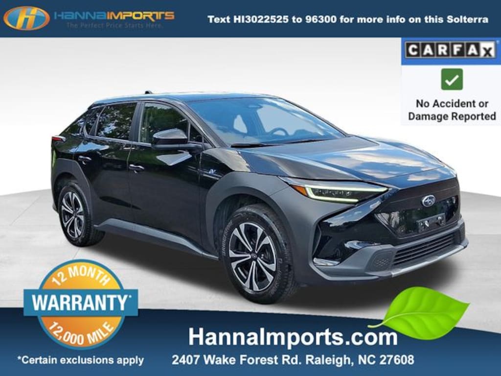 Why shop with Hanna Imports? We specialize in hand-selecting top-quality used cars, trucks, and SUVs for drivers across Raleigh, Durham, Cary, Chapel Hill, and the greater Triangle area of North Carolina. Our massive selection of 1,000+ vehicles on our Raleigh lot is carefully curated to include the most sought-after models, all priced below market value. We believe in transparency and efficiencyâ"our vehicles are aggressively priced from the start, which means no haggling, no hassle, and no wasted time. The price you see is our absolute best price. Whether you're coming from Wake Forest, Apex, Garner, or anywhere in central NC, weâre committed to making your car-buying experience smooth, affordable, and enjoyable. Come see why Hanna Imports is one of the most trusted used car dealerships in North Carolina! Used Subaru Solterra in Raleigh. Used Subaru Solterra in North Carolina, Standard Model, Solterra Premium, Exterior Parking Camera Rear, Remote keyless entry, Steering wheel mounted audio controls, 13.8 Axle Ratio, 4-Wheel Disc Brakes, 6 Speakers, ABS brakes, Air Conditioning, Alloy wheels, AM/FM radio: SiriusXM, Auto High-beam Headlights, Auto-dimming Rear-View mirror, Automatic temperature control, Brake assist, Bumpers: body-color, Cloth Upholstery, Driver door bin, Driver vanity mirror, Dual front impact airbags, Dual front side impact airbags, Electronic Stability Control, Emergency communication system: Subaru Solterra Connect - Safety Connect (1 year trial included), Four wheel independent suspension, Front anti-roll bar, Front Bucket Seats, Front Center Armrest, Front dual zone A/C, Front reading lights, Fully automatic headlights, Heated door mirrors, Heated Front Bucket Seats, Heated front seats, Illuminated entry, Knee airbag, Leather steering wheel, Low tire pressure warning, Occupant sensing airbag, Outside temperature display, Overhead airbag, Overhead console, Panic alarm, Passenger door bin, Passenger vanity mirror, Power door mirrors, Power steering, Power windows, Radio data system, Radio: Subaru Solterra Connect 8.0" Multimedia System, Rear anti-roll bar, Rear reading lights, Rear seat center armrest, Rear window defroster, Security system, Speed control, Speed-sensing steering, Split folding rear seat, Spoiler, Telescoping steering wheel, Tilt steering wheel, Traction control, Trip computer, Variably intermittent wipers, and Wheels: 18" x 7.5" J Aluminum-Alloy.