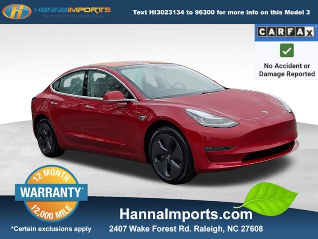 Why shop with Hanna Imports? We specialize in hand-selecting top-quality used cars, trucks, and SUVs for drivers across Raleigh, Durham, Cary, Chapel Hill, and the greater Triangle area of North Carolina. Our massive selection of 1,000+ vehicles on our Raleigh lot is carefully curated to include the most sought-after models, all priced below market value. We believe in transparency and efficiencyâ"our vehicles are aggressively priced from the start, which means no haggling, no hassle, and no wasted time. The price you see is our absolute best price. Whether you're coming from Wake Forest, Apex, Garner, or anywhere in central NC, weâre committed to making your car-buying experience smooth, affordable, and enjoyable. Come see why Hanna Imports is one of the most trusted used car dealerships in North Carolina! Used Tesla Model 3 in Raleigh. Used Tesla Model 3 in North Carolina, Model 3 Long Range, Electronic Stability Control, Lane Departure Warning System, Navigation System, Remote keyless entry, 15 Speakers, 4-Wheel Disc Brakes, ABS brakes, Air Conditioning, Alloy wheels, Auto High-beam Headlights, Auto-dimming door mirrors, Auto-dimming Rear-View mirror, Automatic temperature control, Brake assist, Bumpers: body-color, Compass, Delay-off headlights, Driver door bin, Driver vanity mirror, Dual front impact airbags, Dual front side impact airbags, Exterior Parking Camera Rear, Four wheel independent suspension, Front anti-roll bar, Front Bucket Seats, Front Center Armrest, Front dual zone A/C, Front fog lights, Front reading lights, Fully automatic headlights, Garage door transmitter: Homelink, Genuine wood dashboard insert, Heated door mirrors, Heated Front Bucket Seats, Heated front seats, Heated rear seats, Illuminated entry, Knee airbag, Low tire pressure warning, Memory seat, Occupant sensing airbag, Outside temperature display, Overhead airbag, Passenger door bin, Passenger vanity mirror, Power door mirrors, Power driver seat, Power passenger seat, Power steering, Power windows, Radio data system, Radio: FM w/Premium Audio System, Rear reading lights, Rear seat center armrest, Rear window defroster, Security system, Speed control, Speed-sensing steering, Split folding rear seat, Steering wheel memory, Steering wheel mounted A/C controls, Steering wheel mounted audio controls, Synthetic Leather Seat Trim, Telescoping steering wheel, Tilt steering wheel, Traction control, Trip computer, Variably intermittent wipers, and Wheels: 18" Aero.