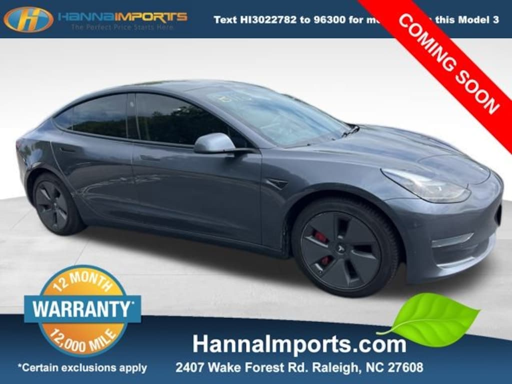 Why shop with Hanna Imports? We specialize in hand-selecting top-quality used cars, trucks, and SUVs for drivers across Raleigh, Durham, Cary, Chapel Hill, and the greater Triangle area of North Carolina. Our massive selection of 1,000+ vehicles on our Raleigh lot is carefully curated to include the most sought-after models, all priced below market value. We believe in transparency and efficiencyâ"our vehicles are aggressively priced from the start, which means no haggling, no hassle, and no wasted time. The price you see is our absolute best price. Whether you're coming from Wake Forest, Apex, Garner, or anywhere in central NC, weâre committed to making your car-buying experience smooth, affordable, and enjoyable. Come see why Hanna Imports is one of the most trusted used car dealerships in North Carolina! Used Tesla Model 3 in Raleigh. Used Tesla Model 3 in North Carolina, Model 3 Standard Range Plus, Exterior Parking Camera Rear, Heated front seats, Heated rear seats, Lane Departure Warning System, Navigation System, 4-Wheel Disc Brakes, 8 Speakers, ABS brakes, Air Conditioning, Alloy wheels, Auto High-beam Headlights, Auto-dimming door mirrors, Auto-dimming Rear-View mirror, Automatic temperature control, Brake assist, Bumpers: body-color, Compass, Delay-off headlights, Driver door bin, Driver vanity mirror, Dual front impact airbags, Dual front side impact airbags, Electronic Stability Control, Four wheel independent suspension, Front anti-roll bar, Front Bucket Seats, Front Center Armrest, Front dual zone A/C, Front reading lights, Fully automatic headlights, Genuine wood dashboard insert, Heated door mirrors, Heated steering wheel, Illuminated entry, Knee airbag, Low tire pressure warning, Memory seat, Occupant sensing airbag, Outside temperature display, Overhead airbag, Passenger door bin, Passenger vanity mirror, Power door mirrors, Power driver seat, Power passenger seat, Power steering, Power windows, Premium Heated Front Bucket Seats, Premium Seat Trim, Radio data system, Radio: Upgraded Audio System, Rear reading lights, Rear seat center armrest, Rear window defroster, Security system, Speed control, Speed-sensing steering, Split folding rear seat, Steering wheel memory, Steering wheel mounted A/C controls, Steering wheel mounted audio controls, Telescoping steering wheel, Tilt steering wheel, Traction control, Trip computer, Variably intermittent wipers, and Wheels: 18" x 8.5" Aero.