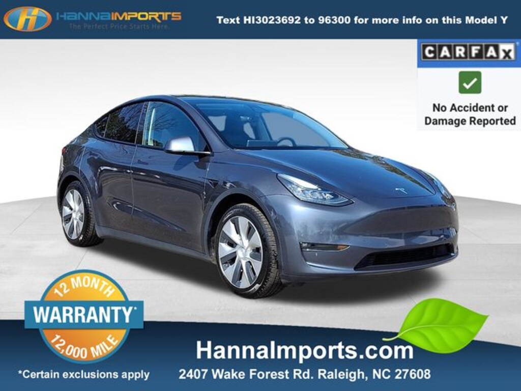 Why shop with Hanna Imports? We specialize in hand-selecting top-quality used cars, trucks, and SUVs for drivers across Raleigh, Durham, Cary, Chapel Hill, and the greater Triangle area of North Carolina. Our massive selection of 1,000+ vehicles on our Raleigh lot is carefully curated to include the most sought-after models, all priced below market value. We believe in transparency and efficiencyâ"our vehicles are aggressively priced from the start, which means no haggling, no hassle, and no wasted time. The price you see is our absolute best price. Whether you're coming from Wake Forest, Apex, Garner, or anywhere in central NC, weâre committed to making your car-buying experience smooth, affordable, and enjoyable. Come see why Hanna Imports is one of the most trusted used car dealerships in North Carolina! Used Tesla Model Y in Raleigh. Used Tesla Model Y in North Carolina, Model Y Long Range, Exterior Parking Camera Rear, Heated front seats, Lane Departure Warning System, Navigation System, Power Liftgate, Remote keyless entry, 15 Speakers, 4-Wheel Disc Brakes, 5 Seat Interior, 9.0 Axle Ratio, ABS brakes, Air Conditioning, Alloy wheels, Auto High-beam Headlights, Auto tilt-away steering wheel, Auto-dimming door mirrors, Auto-dimming Rear-View mirror, Automatic temperature control, Brake assist, Bumpers: body-color, Compass, Delay-off headlights, Driver door bin, Driver vanity mirror, Dual front impact airbags, Dual front side impact airbags, Electronic Stability Control, Four wheel independent suspension, Front anti-roll bar, Front Bucket Seats, Front Center Armrest, Front dual zone A/C, Front fog lights, Front reading lights, Fully automatic headlights, Genuine wood dashboard insert, Heated door mirrors, Heated rear seats, Heated steering wheel, Illuminated entry, Knee airbag, Low tire pressure warning, Memory seat, Occupant sensing airbag, Outside temperature display, Overhead airbag, Passenger door bin, Passenger vanity mirror, Power door mirrors, Power driver seat, Power passenger seat, Power steering, Power windows, Premium Audio System, Premium Seat Trim, Radio data system, Rain sensing wipers, Rear reading lights, Rear seat center armrest, Rear window defroster, Security system, Speed control, Speed-sensing steering, Split folding rear seat, Steering wheel memory, Steering wheel mounted A/C controls, Steering wheel mounted audio controls, Telescoping steering wheel, Tilt steering wheel, Traction control, Trip computer, Variably intermittent wipers, and Wheels: 19" x 9.5" Gemini.