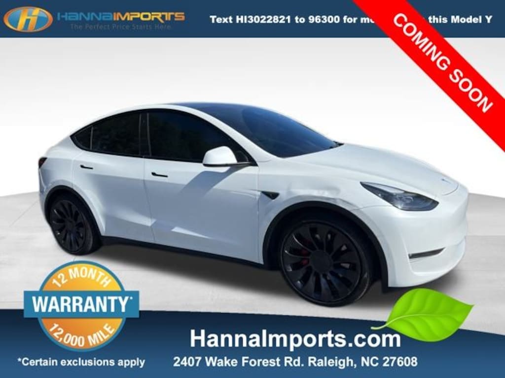 Why shop with Hanna Imports? We specialize in hand-selecting top-quality used cars, trucks, and SUVs for drivers across Raleigh, Durham, Cary, Chapel Hill, and the greater Triangle area of North Carolina. Our massive selection of 1,000+ vehicles on our Raleigh lot is carefully curated to include the most sought-after models, all priced below market value. We believe in transparency and efficiencyâ"our vehicles are aggressively priced from the start, which means no haggling, no hassle, and no wasted time. The price you see is our absolute best price. Whether you're coming from Wake Forest, Apex, Garner, or anywhere in central NC, weâre committed to making your car-buying experience smooth, affordable, and enjoyable. Come see why Hanna Imports is one of the most trusted used car dealerships in North Carolina! Used Tesla Model Y in Raleigh. Used Tesla Model Y in North Carolina, Model Y Performance, AWD, Exterior Parking Camera Rear, Heated front seats, Heated rear seats, Lane Departure Warning System, Navigation System, Power Liftgate, Remote keyless entry, 15 Speakers, 4-Wheel Disc Brakes, 5 Seat Interior, 9.0 Axle Ratio, ABS brakes, Air Conditioning, Alloy wheels, Auto High-beam Headlights, Auto tilt-away steering wheel, Auto-dimming door mirrors, Auto-dimming Rear-View mirror, Automatic temperature control, Brake assist, Bumpers: body-color, Compass, Delay-off headlights, Driver door bin, Driver vanity mirror, Dual front impact airbags, Dual front side impact airbags, Electronic Stability Control, Four wheel independent suspension, Front anti-roll bar, Front Bucket Seats, Front Center Armrest, Front dual zone A/C, Front fog lights, Front reading lights, Fully automatic headlights, Genuine wood dashboard insert, Heated door mirrors, Heated steering wheel, Illuminated entry, Knee airbag, Low tire pressure warning, Memory seat, Occupant sensing airbag, Outside temperature display, Overhead airbag, Passenger door bin, Passenger vanity mirror, Power door mirrors, Power driver seat, Power passenger seat, Power steering, Power windows, Premium Audio System, Premium Seat Trim, Radio data system, Rain sensing wipers, Rear reading lights, Rear seat center armrest, Rear window defroster, Security system, Speed control, Speed-sensing steering, Split folding rear seat, Spoiler, Steering wheel memory, Steering wheel mounted A/C controls, Steering wheel mounted audio controls, Telescoping steering wheel, Tilt steering wheel, Traction control, Trip computer, Variably intermittent wipers, and Wheels: 21" x 9.5 Fr & 21" x 10.5 Rr Uberturbine.