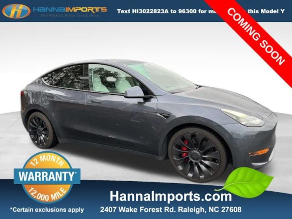 Why shop with Hanna Imports? We specialize in hand-selecting top-quality used cars, trucks, and SUVs for drivers across Raleigh, Durham, Cary, Chapel Hill, and the greater Triangle area of North Carolina. Our massive selection of 1,000+ vehicles on our Raleigh lot is carefully curated to include the most sought-after models, all priced below market value. We believe in transparency and efficiencyâ"our vehicles are aggressively priced from the start, which means no haggling, no hassle, and no wasted time. The price you see is our absolute best price. Whether you're coming from Wake Forest, Apex, Garner, or anywhere in central NC, weâre committed to making your car-buying experience smooth, affordable, and enjoyable. Come see why Hanna Imports is one of the most trusted used car dealerships in North Carolina! Used Tesla Model Y in Raleigh. Used Tesla Model Y in North Carolina, Exterior Parking Camera Rear, Heated front seats, Heated rear seats, Lane Departure Warning System, Navigation System, Power Liftgate, 14 Speakers, 4-Wheel Disc Brakes, 5 Seat Interior, 9.0 Axle Ratio, ABS brakes, Air Conditioning, Alloy wheels, Audio memory, Auto High-beam Headlights, Auto tilt-away steering wheel, Auto-dimming door mirrors, Auto-dimming Rear-View mirror, Automatic temperature control, Brake assist, Bumpers: body-color, Compass, Delay-off headlights, Driver door bin, Driver vanity mirror, Dual front impact airbags, Dual front side impact airbags, Electronic Stability Control, Four wheel independent suspension, Front anti-roll bar, Front Bucket Seats, Front Center Armrest, Front dual zone A/C, Front fog lights, Front reading lights, Fully automatic headlights, Genuine wood dashboard insert, Heated door mirrors, Heated steering wheel, HVAC memory, Illuminated entry, Knee airbag, Low tire pressure warning, Memory seat, Occupant sensing airbag, Outside temperature display, Overhead airbag, Passenger door bin, Passenger vanity mirror, Power door mirrors, Power driver seat, Power passenger seat, Power steering, Power windows, Premium Audio System, Premium Seat Trim, Radio data system, Rain sensing wipers, Rear reading lights, Rear seat center armrest, Rear window defroster, Remote keyless entry, Security system, Speed control, Speed-sensing steering, Split folding rear seat, Spoiler, Steering wheel memory, Steering wheel mounted A/C controls, Steering wheel mounted audio controls, Telescoping steering wheel, Tilt steering wheel, Traction control, Trip computer, Variably intermittent wipers, and Wheels: 21" x 9.5 Fr & 21" x 10.5 Rr Uberturbine.