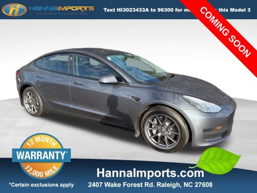 Why shop with Hanna Imports? We specialize in hand-selecting top-quality used cars, trucks, and SUVs for drivers across Raleigh, Durham, Cary, Chapel Hill, and the greater Triangle area of North Carolina. Our massive selection of 1,000+ vehicles on our Raleigh lot is carefully curated to include the most sought-after models, all priced below market value. We believe in transparency and efficiencyâ"our vehicles are aggressively priced from the start, which means no haggling, no hassle, and no wasted time. The price you see is our absolute best price. Whether you're coming from Wake Forest, Apex, Garner, or anywhere in central NC, weâre committed to making your car-buying experience smooth, affordable, and enjoyable. Come see why Hanna Imports is one of the most trusted used car dealerships in North Carolina! Used Tesla Model 3 in Raleigh. Used Tesla Model 3 in North Carolina, Exterior Parking Camera Rear, Lane Departure Warning System, Navigation System, 4-Wheel Disc Brakes, 8 Speakers, ABS brakes, Air Conditioning, Alloy wheels, Audio memory, Auto High-beam Headlights, Auto-dimming door mirrors, Auto-dimming Rear-View mirror, Automatic temperature control, Brake assist, Bumpers: body-color, Compass, Delay-off headlights, Driver door bin, Driver vanity mirror, Dual front impact airbags, Dual front side impact airbags, Electronic Stability Control, Emergency communication system, Four wheel independent suspension, Front anti-roll bar, Front Bucket Seats, Front Center Armrest, Front dual zone A/C, Front reading lights, Fully automatic headlights, Genuine wood dashboard insert, Heated door mirrors, Heated Front Bucket Seats, Heated front seats, Heated rear seats, Heated steering wheel, HVAC memory, Illuminated entry, Knee airbag, Low tire pressure warning, Memory seat, Occupant sensing airbag, Outside temperature display, Overhead airbag, Passenger door bin, Passenger vanity mirror, Power door mirrors, Power driver seat, Power passenger seat, Power steering, Power windows, Premium Seat Trim, Radio data system, Radio: Upgraded Audio System, Rain sensing wipers, Rear reading lights, Rear seat center armrest, Rear window defroster, Security system, Speed control, Speed-sensing steering, Split folding rear seat, Steering wheel memory, Steering wheel mounted A/C controls, Steering wheel mounted audio controls, Telescoping steering wheel, Tilt steering wheel, Traction control, Trip computer, Variably intermittent wipers, and Wheels: 18" x 8.5" Aero.