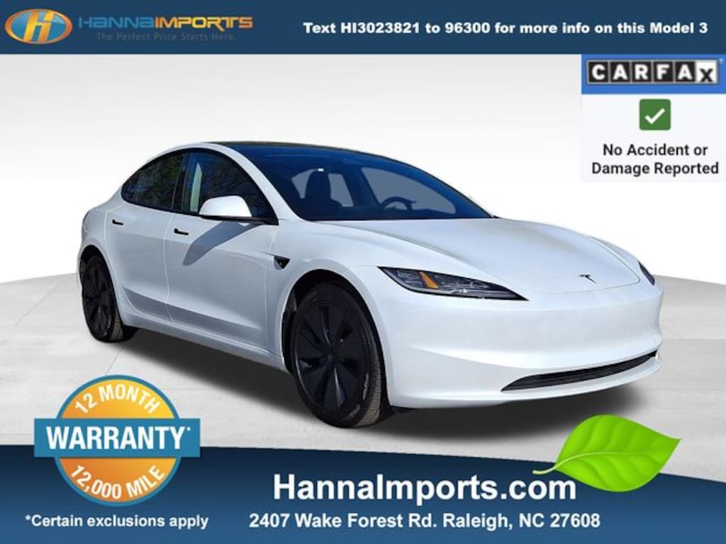 Why shop with Hanna Imports? We specialize in hand-selecting top-quality used cars, trucks, and SUVs for drivers across Raleigh, Durham, Cary, Chapel Hill, and the greater Triangle area of North Carolina. Our massive selection of 1,000+ vehicles on our Raleigh lot is carefully curated to include the most sought-after models, all priced below market value. We believe in transparency and efficiencyâ"our vehicles are aggressively priced from the start, which means no haggling, no hassle, and no wasted time. The price you see is our absolute best price. Whether you're coming from Wake Forest, Apex, Garner, or anywhere in central NC, weâre committed to making your car-buying experience smooth, affordable, and enjoyable. Come see why Hanna Imports is one of the most trusted used car dealerships in North Carolina! Used Tesla Model 3 in Raleigh. Used Tesla Model 3 in North Carolina, Model 3 Long Range, Exterior Parking Camera Rear, Heated and Ventilated Front Seats, Heated steering wheel, Lane Departure Warning System, Navigation System, 4-Wheel Disc Brakes, 9 Speakers, ABS brakes, Air Conditioning, Alloy wheels, Audio memory, Auto High-beam Headlights, Auto-dimming door mirrors, Auto-dimming Rear-View mirror, Automatic temperature control, Brake assist, Bumpers: body-color, Compass, Delay-off headlights, Driver door bin, Driver vanity mirror, Dual front impact airbags, Dual front side impact airbags, Electronic Stability Control, Emergency communication system, Four wheel independent suspension, Front anti-roll bar, Front Bucket Seats, Front Center Armrest w/Storage, Front dual zone A/C, Front reading lights, Fully automatic headlights, Heated door mirrors, Heated front seats, Heated rear seats, HVAC memory, Illuminated entry, Knee airbag, Low tire pressure warning, Memory seat, Occupant sensing airbag, Outside temperature display, Overhead airbag, Passenger door bin, Passenger vanity mirror, Power door mirrors, Power driver seat, Power passenger seat, Power steering, Power windows, Radio data system, Radio: Base Audio System, Rain sensing wipers, Rear air conditioning, Rear audio controls, Rear reading lights, Rear seat center armrest, Rear window defroster, Security system, Speed control, Speed-sensing steering, Split folding rear seat, Steering wheel memory, Steering wheel mounted A/C controls, Steering wheel mounted audio controls, Telescoping steering wheel, Tilt steering wheel, Traction control, Trip computer, Variably intermittent wipers, Vegan Leather Seat Trim, Ventilated front seats, and Wheels: 18" x 8.5" Photon.