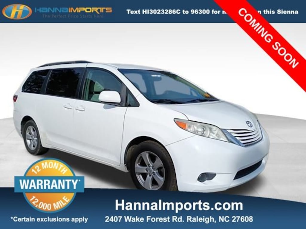 Why shop with Hanna Imports? We specialize in hand-selecting top-quality used cars, trucks, and SUVs for drivers across Raleigh, Durham, Cary, Chapel Hill, and the greater Triangle area of North Carolina. Our massive selection of 1,000+ vehicles on our Raleigh lot is carefully curated to include the most sought-after models, all priced below market value. We believe in transparency and efficiencyâ"our vehicles are aggressively priced from the start, which means no haggling, no hassle, and no wasted time. The price you see is our absolute best price. Whether you're coming from Wake Forest, Apex, Garner, or anywhere in central NC, weâre committed to making your car-buying experience smooth, affordable, and enjoyable. Come see why Hanna Imports is one of the most trusted used car dealerships in North Carolina! Used Toyota Sienna in Raleigh. Used Toyota Sienna in North Carolina, Sienna LE 8 Passenger, ABS brakes, Alloy wheels, Bumpers: body-color, Compass, Electronic Stability Control, Exterior Parking Camera Rear, Front dual zone A/C, Heated door mirrors, Illuminated entry, Low tire pressure warning, Power door mirrors, Remote keyless entry, Roof rack: rails only, Spoiler, Traction control, 17" x 7" 5-Spoke Alloy Wheels, 3rd row seats: split-bench, 4-Wheel Disc Brakes, 6 Speakers, Air Conditioning, AM/FM radio: SiriusXM, Auto-dimming Rear-View mirror, Automatic temperature control, Axle Ratio: 3.94, Brake assist, CD player, Delay-off headlights, Door auto-latch, Driver door bin, Driver vanity mirror, Driver's Seat Mounted Armrest, Dual front impact airbags, Dual front side impact airbags, Fabric Seat Material, Front anti-roll bar, Front Bucket Seats, Front reading lights, Front wheel independent suspension, Fully automatic headlights, Garage door transmitter: HomeLink, Knee airbag, Occupant sensing airbag, Outside temperature display, Overhead airbag, Overhead console, Panic alarm, Passenger door bin, Passenger seat mounted armrest, Passenger vanity mirror, Power driver seat, Power steering, Power windows, Radio data system, Radio: AM/FM/HD/CD w/6 Speakers, Rear air conditioning, Rear anti-roll bar, Rear reading lights, Rear window defroster, Rear window wiper, Reclining 3rd row seat, Speed control, Speed-sensing steering, Split folding rear seat, Steering wheel mounted audio controls, Tachometer, Telescoping steering wheel, Tilt steering wheel, Trip computer, and Variably intermittent wipers.