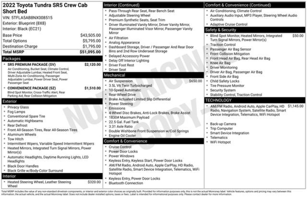 Why shop with Hanna Imports? We specialize in hand-selecting top-quality used cars, trucks, and SUVs for drivers across Raleigh, Durham, Cary, Chapel Hill, and the greater Triangle area of North Carolina. Our massive selection of 1,000+ vehicles on our Raleigh lot is carefully curated to include the most sought-after models, all priced below market value. We believe in transparency and efficiencyâ"our vehicles are aggressively priced from the start, which means no haggling, no hassle, and no wasted time. The price you see is our absolute best price. Whether you're coming from Wake Forest, Apex, Garner, or anywhere in central NC, weâre committed to making your car-buying experience smooth, affordable, and enjoyable. Come see why Hanna Imports is one of the most trusted used car dealerships in North Carolina! Used Toyota Tundra in Raleigh. Used Toyota Tundra in North Carolina, Cloth, 18" x 8" Alloy Wheels, 3.31 Axle Ratio, 4-Wheel Disc Brakes, 9 Speakers, ABS brakes, Air Conditioning, Alloy wheels, AM/FM Radio, AM/FM radio: SiriusXM, Apple CarPlay/Android Auto, Auto High-beam Headlights, Automatic temperature control, Brake assist, Bumpers: body-color, Delay-off headlights, Driver door bin, Driver vanity mirror, Dual front impact airbags, Dual front side impact airbags, Electronic Stability Control, Emergency communication system: Safety Connect with 1-year trial, Exterior Parking Camera Rear, Fabric Seat Trim, Front anti-roll bar, Front Bucket Seats, Front Center Armrest, Front fog lights, Front reading lights, Front wheel independent suspension, Fully automatic headlights, Heated door mirrors, Illuminated entry, Knee airbag, Low tire pressure warning, Occupant sensing airbag, Outside temperature display, Overhead airbag, Overhead console, Panic alarm, Passenger door bin, Passenger vanity mirror, Power door mirrors, Power steering, Power windows, Radio data system, Rear reading lights, Rear step bumper, Rear window defroster, Remote keyless entry, Security system, Speed control, Speed-sensing steering, Split folding rear seat, Steering wheel mounted audio controls, Tachometer, Telescoping steering wheel, Tilt steering wheel, Traction control, Trip computer, Turn signal indicator mirrors, Variably intermittent wipers, and Voltmeter.