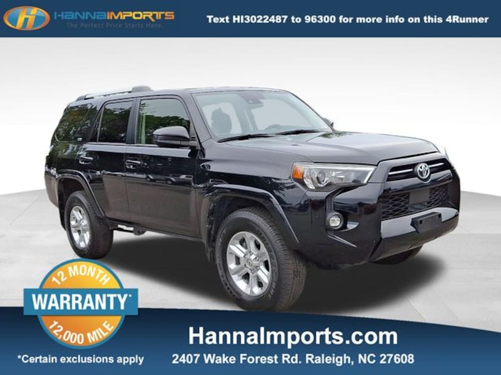Why shop with Hanna Imports? We specialize in hand-selecting top-quality used cars, trucks, and SUVs for drivers across Raleigh, Durham, Cary, Chapel Hill, and the greater Triangle area of North Carolina. Our massive selection of 1,000+ vehicles on our Raleigh lot is carefully curated to include the most sought-after models, all priced below market value. We believe in transparency and efficiencyâ"our vehicles are aggressively priced from the start, which means no haggling, no hassle, and no wasted time. The price you see is our absolute best price. Whether you're coming from Wake Forest, Apex, Garner, or anywhere in central NC, weâre committed to making your car-buying experience smooth, affordable, and enjoyable. Come see why Hanna Imports is one of the most trusted used car dealerships in North Carolina! Used Toyota 4Runner in Raleigh. Used Toyota 4Runner in North Carolina, 4Runner SR5, 4WD, Black/Graphite w/Fabric Seat Trim, Apple CarPlay/Android Auto, Exterior Parking Camera Rear, Fabric-Trimmed 50/50 Split Fold-Flat 3rd Row, Remote keyless entry, Steering wheel mounted audio controls, Trunk Carpet, 17" 6-Spoke Alloy Wheels, 3.727 Axle Ratio, 4-Wheel Disc Brakes, 8 Speakers, ABS brakes, Air Conditioning, Alloy wheels, AM/FM radio: SiriusXM, Anti-whiplash front head restraints, Auto High-beam Headlights, Brake assist, Bumpers: body-color, Driver door bin, Driver vanity mirror, Dual front impact airbags, Dual front side impact airbags, Electronic Stability Control, Emergency communication system: Safety Connect (1-year trial), Fabric Seat Trim, Front anti-roll bar, Front Bucket Seats, Front Center Armrest, Front fog lights, Front reading lights, Front wheel independent suspension, Heated door mirrors, Illuminated entry, Knee airbag, Leather Shift Knob, Leather steering wheel, Low tire pressure warning, Occupant sensing airbag, Outside temperature display, Overhead airbag, Overhead console, Panic alarm, Passenger door bin, Passenger vanity mirror, Power door mirrors, Power driver seat, Power steering, Power windows, Radio: Audio, Rear anti-roll bar, Rear seat center armrest, Rear window defroster, Rear window wiper, Security system, Speed control, Speed-sensing steering, Split folding rear seat, Spoiler, Tachometer, Telescoping steering wheel, Tilt steering wheel, Traction control, Trip computer, and Variably intermittent wipers.