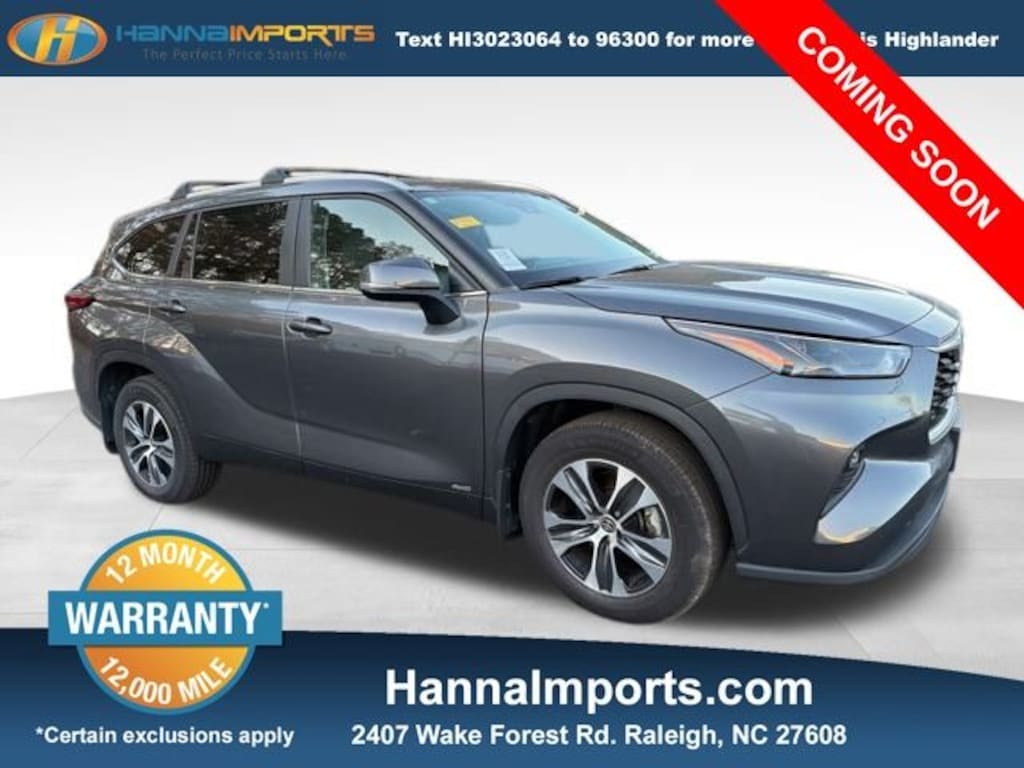 Why shop with Hanna Imports? We specialize in hand-selecting top-quality used cars, trucks, and SUVs for drivers across Raleigh, Durham, Cary, Chapel Hill, and the greater Triangle area of North Carolina. Our massive selection of 1,000+ vehicles on our Raleigh lot is carefully curated to include the most sought-after models, all priced below market value. We believe in transparency and efficiencyâ"our vehicles are aggressively priced from the start, which means no haggling, no hassle, and no wasted time. The price you see is our absolute best price. Whether you're coming from Wake Forest, Apex, Garner, or anywhere in central NC, weâre committed to making your car-buying experience smooth, affordable, and enjoyable. Come see why Hanna Imports is one of the most trusted used car dealerships in North Carolina! Used Toyota Highlander Hybrid in Raleigh. Used Toyota Highlander Hybrid in North Carolina, Highlander Hybrid XLE, 2.5L I4 PDI Hybrid DOHC 16V LEV3-SULEV30, AWD, 3rd row seats: split-bench, Apple CarPlay/Android Auto, Exterior Parking Camera Rear, Heated Front Bucket Seats, Power Liftgate, Power moonroof, Remote keyless entry, 18" Machined Alloy Wheels, 4-Wheel Disc Brakes, 6 Speakers, ABS brakes, Air Conditioning, Alloy wheels, AM/FM radio: SiriusXM, Auto High-beam Headlights, Auto-dimming Rear-View mirror, Automatic temperature control, Axle Ratio: TBD, Brake assist, Bumpers: body-color, Delay-off headlights, Driver door bin, Driver vanity mirror, Dual front impact airbags, Dual front side impact airbags, Electronic Stability Control, Emergency communication system: Safety Connect (up to 10-year trial subscription), Four wheel independent suspension, Front anti-roll bar, Front Bucket Seats, Front Center Armrest, Front dual zone A/C, Front fog lights, Front reading lights, Fully automatic headlights, Garage door transmitter: HomeLink, Heated door mirrors, Heated front seats, Illuminated entry, Knee airbag, Leather Shift Knob, Leather steering wheel, Low tire pressure warning, Occupant sensing airbag, Outside temperature display, Overhead airbag, Overhead console, Panic alarm, Passenger door bin, Passenger vanity mirror, Power door mirrors, Power driver seat, Power passenger seat, Power steering, Power windows, Radio: 8" Toyota Audio Multimedia, Rear air conditioning, Rear anti-roll bar, Rear reading lights, Rear window defroster, Rear window wiper, Reclining 3rd row seat, Roof rack: rails only, Security system, SofTex Seat Trim, Speed control, Speed-sensing steering, Split folding rear seat, Spoiler, Steering wheel mounted audio controls, Telescoping steering wheel, Tilt steering wheel, Traction control, Trip computer, Turn signal indicator mirrors, and Variably intermittent wipers.