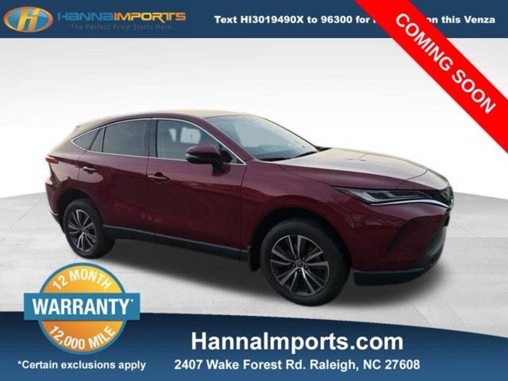 Why shop with Hanna Imports? We specialize in hand-selecting top-quality used cars, trucks, and SUVs for drivers across Raleigh, Durham, Cary, Chapel Hill, and the greater Triangle area of North Carolina. Our massive selection of 1,000+ vehicles on our Raleigh lot is carefully curated to include the most sought-after models, all priced below market value. We believe in transparency and efficiencyâ"our vehicles are aggressively priced from the start, which means no haggling, no hassle, and no wasted time. The price you see is our absolute best price. Whether you're coming from Wake Forest, Apex, Garner, or anywhere in central NC, weâre committed to making your car-buying experience smooth, affordable, and enjoyable. Come see why Hanna Imports is one of the most trusted used car dealerships in North Carolina! Used Toyota Venza in Raleigh. Used Toyota Venza in North Carolina, Venza LE, AWD, Apple CarPlay/Android Auto, Exterior Parking Camera Rear, Navigation System, Power Liftgate, Remote keyless entry, 4-Wheel Disc Brakes, 6 Speakers, ABS brakes, Air Conditioning, Alloy wheels, AM/FM radio: SiriusXM, Auto High-beam Headlights, Automatic temperature control, Axle Ratio: TBD, Brake assist, Bumpers: body-color, Driver door bin, Driver vanity mirror, Dual front impact airbags, Dual front side impact airbags, Electronic Stability Control, Emergency communication system: Safety Connect (1-year trial), Fabric Seat Trim, Four wheel independent suspension, Front anti-roll bar, Front Bucket Seats, Front Center Armrest, Front dual zone A/C, Front reading lights, Fully automatic headlights, Illuminated entry, Knee airbag, Leather Shift Knob, Leather steering wheel, Low tire pressure warning, Occupant sensing airbag, Outside temperature display, Overhead airbag, Overhead console, Panic alarm, Passenger door bin, Passenger vanity mirror, Power door mirrors, Power driver seat, Power steering, Power windows, Radio data system, Radio: Audio Plus, Rear anti-roll bar, Rear seat center armrest, Rear window defroster, Rear window wiper, Speed control, Speed-sensing steering, Split folding rear seat, Spoiler, Steering wheel mounted audio controls, Telescoping steering wheel, Tilt steering wheel, Traction control, Trip computer, Turn signal indicator mirrors, Variably intermittent wipers, and Wheels: 7 x 18" Alloy.