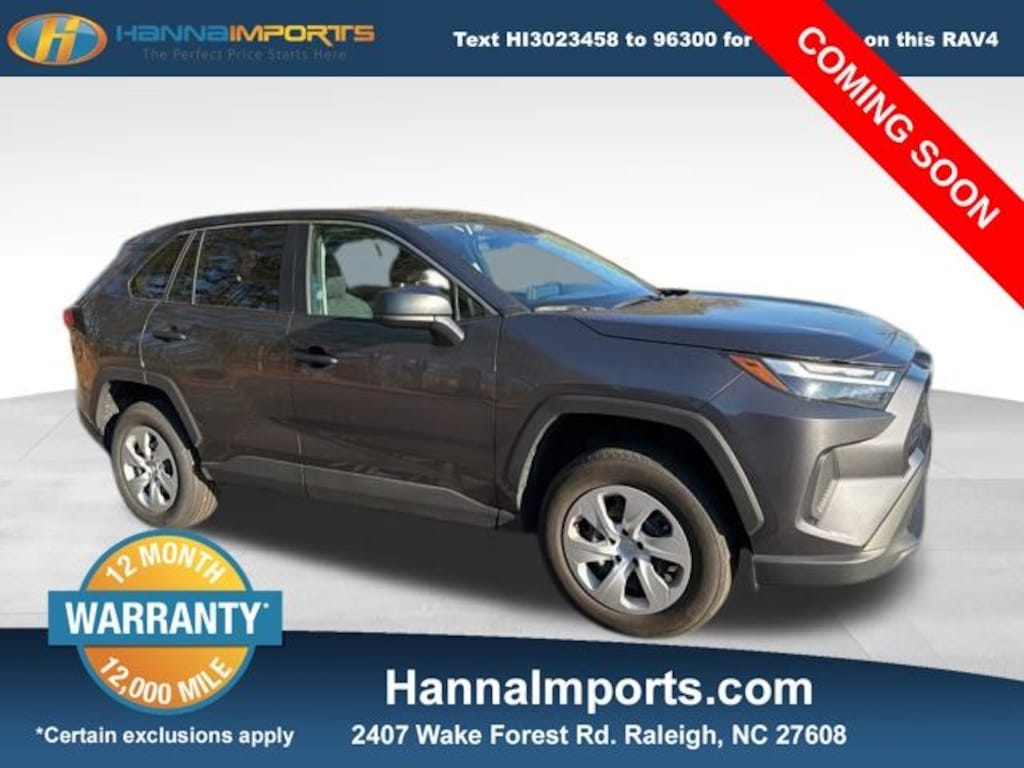Why shop with Hanna Imports? We specialize in hand-selecting top-quality used cars, trucks, and SUVs for drivers across Raleigh, Durham, Cary, Chapel Hill, and the greater Triangle area of North Carolina. Our massive selection of 1,000+ vehicles on our Raleigh lot is carefully curated to include the most sought-after models, all priced below market value. We believe in transparency and efficiencyâ"our vehicles are aggressively priced from the start, which means no haggling, no hassle, and no wasted time. The price you see is our absolute best price. Whether you're coming from Wake Forest, Apex, Garner, or anywhere in central NC, weâre committed to making your car-buying experience smooth, affordable, and enjoyable. Come see why Hanna Imports is one of the most trusted used car dealerships in North Carolina! Used Toyota RAV4 in Raleigh. Used Toyota RAV4 in North Carolina, RAV4 LE, AWD, Black w/Fabric Seat Trim, Exterior Parking Camera Rear, Remote keyless entry, 17" Steel Wheels, 4-Wheel Disc Brakes, 6 Speakers, ABS brakes, Air Conditioning, AM/FM radio: SiriusXM, Auto High-beam Headlights, Axle Ratio: 3.177, Brake assist, Bumpers: body-color, Driver door bin, Driver vanity mirror, Dual front impact airbags, Dual front side impact airbags, Electronic Stability Control, Emergency communication system: Safety Connect (10-year trial), Fabric Seat Trim, Four wheel independent suspension, Front anti-roll bar, Front Bucket Seats, Front Center Armrest, Front reading lights, Illuminated entry, Knee airbag, Low tire pressure warning, Occupant sensing airbag, Outside temperature display, Overhead airbag, Overhead console, Panic alarm, Passenger door bin, Passenger vanity mirror, Power door mirrors, Power steering, Power windows, Radio data system, Radio: AM/FM/XM Audio System, Rear anti-roll bar, Rear seat center armrest, Rear window defroster, Rear window wiper, Speed control, Speed-sensing steering, Split folding rear seat, Spoiler, Steering wheel mounted audio controls, Tachometer, Telescoping steering wheel, Tilt steering wheel, Traction control, and Trip computer.