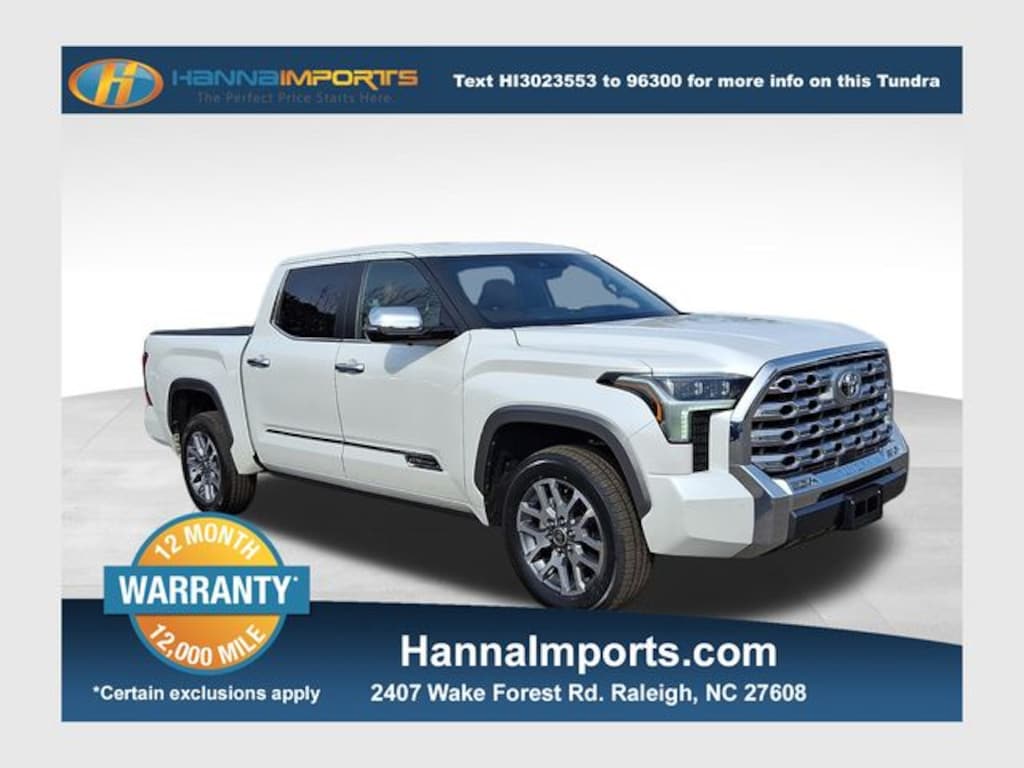 Why shop with Hanna Imports? We specialize in hand-selecting top-quality used cars, trucks, and SUVs for drivers across Raleigh, Durham, Cary, Chapel Hill, and the greater Triangle area of North Carolina. Our massive selection of 1,000+ vehicles on our Raleigh lot is carefully curated to include the most sought-after models, all priced below market value. We believe in transparency and efficiencyâ"our vehicles are aggressively priced from the start, which means no haggling, no hassle, and no wasted time. The price you see is our absolute best price. Whether you're coming from Wake Forest, Apex, Garner, or anywhere in central NC, weâre committed to making your car-buying experience smooth, affordable, and enjoyable. Come see why Hanna Imports is one of the most trusted used car dealerships in North Carolina! Used Toyota Tundra in Raleigh. Used Toyota Tundra in North Carolina, Tundra 1794, 3.4L V6, 4WD, Black w/Leather Seat Trim, Apple CarPlay/Android Auto, Exterior Parking Camera Rear, Heated front seats, Heated rear seats, Navigation System, Power moonroof, 10-Way Pwr Adj Heated and Ventilated Front Seats, 12 Speakers, 3.31 Axle Ratio, 4-Wheel Disc Brakes, ABS brakes, Air Conditioning, Alloy wheels, AM/FM radio: SiriusXM, Auto High-beam Headlights, Auto-dimming door mirrors, Auto-dimming Rear-View mirror, Automatic temperature control, Brake assist, Bumpers: body-color, Chrome Exhaust Tail Pipe & Diffuser, Delay-off headlights, Driver door bin, Driver vanity mirror, Dual front impact airbags, Dual front side impact airbags, Electronic Stability Control, Emergency communication system: Safety Connect (10-year trial), Front anti-roll bar, Front Bucket Seats, Front Center Armrest, Front dual zone A/C, Front fog lights, Front reading lights, Front wheel independent suspension, Fully automatic headlights, Garage door transmitter: HomeLink, Heated door mirrors, Heated steering wheel, Illuminated entry, Knee airbag, Leather Seat Trim, Leather Shift Knob, Low tire pressure warning, Memory seat, Occupant sensing airbag, Outside temperature display, Overhead airbag, Overhead console, Panic alarm, Passenger door bin, Passenger vanity mirror, Power door mirrors, Power driver seat, Power passenger seat, Power steering, Power windows, Radio data system, Radio: Audio Multimedia System, Rain sensing wipers, Rear reading lights, Rear seat center armrest, Rear step bumper, Rear window defroster, Remote keyless entry, Safety Connect, Security system, Speed control, Speed-sensing steering, Split folding rear seat, Steering wheel memory, Steering wheel mounted audio controls, Tachometer, Telescoping steering wheel, Tilt steering wheel, Traction control, Trip computer, Turn signal indicator mirrors, Variably intermittent wipers, Ventilated front seats, Ventilated rear seats, Voltmeter, and Wheels: 20" Machined Finish Alloy.