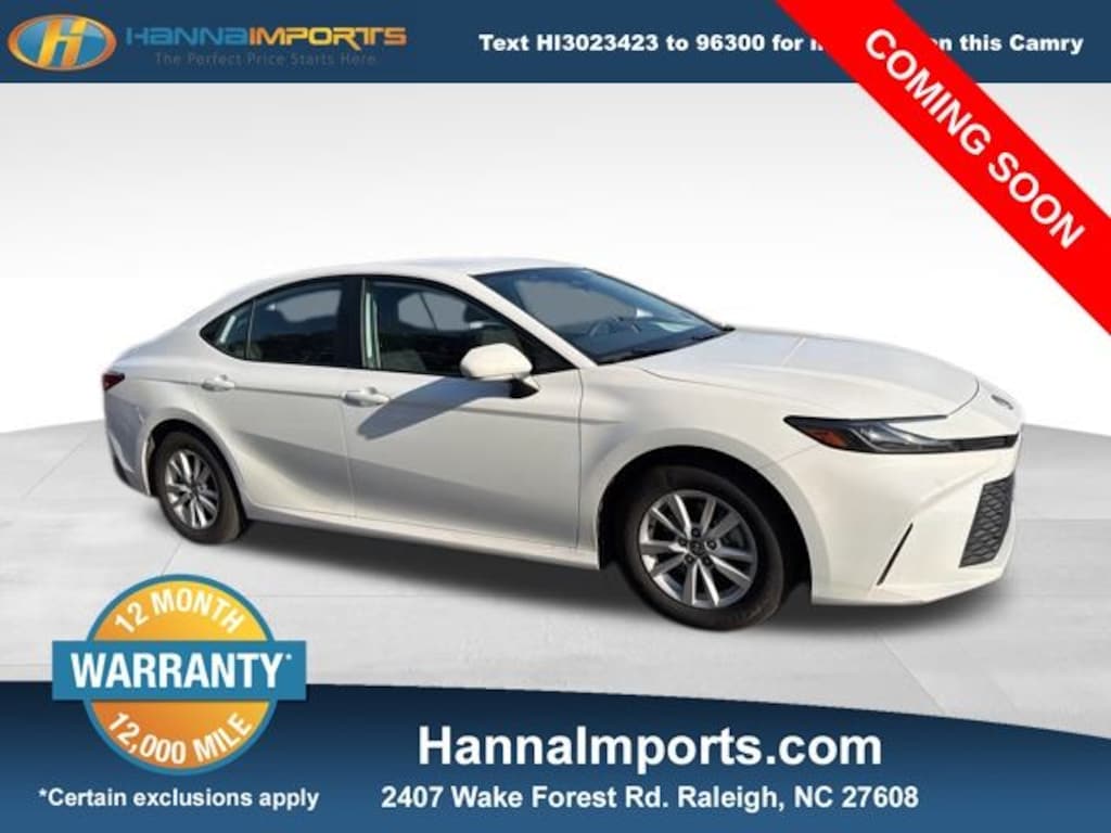 Why shop with Hanna Imports? We specialize in hand-selecting top-quality used cars, trucks, and SUVs for drivers across Raleigh, Durham, Cary, Chapel Hill, and the greater Triangle area of North Carolina. Our massive selection of 1,000+ vehicles on our Raleigh lot is carefully curated to include the most sought-after models, all priced below market value. We believe in transparency and efficiencyâ"our vehicles are aggressively priced from the start, which means no haggling, no hassle, and no wasted time. The price you see is our absolute best price. Whether you're coming from Wake Forest, Apex, Garner, or anywhere in central NC, weâre committed to making your car-buying experience smooth, affordable, and enjoyable. Come see why Hanna Imports is one of the most trusted used car dealerships in North Carolina! Used Toyota Camry in Raleigh. Used Toyota Camry in North Carolina, Camry LE, 2.5L 4-Cylinder 16V DOHC, Black w/Fabric Seat Trim, Apple CarPlay/Android Auto, Exterior Parking Camera Rear, Remote keyless entry, 4-Wheel Disc Brakes, 6 Speakers, ABS brakes, Air Conditioning, Alloy wheels, AM/FM radio: SiriusXM, Auto High-beam Headlights, Automatic temperature control, Brake assist, Bumpers: body-color, Delay-off headlights, Driver door bin, Driver vanity mirror, Dual front impact airbags, Dual front side impact airbags, Electronic Stability Control, Emergency communication system: Safety Connect (up to 10-year trial subscription), Fabric Seat Trim, Four wheel independent suspension, Front anti-roll bar, Front Bucket Seats, Front Center Armrest, Front dual zone A/C, Front reading lights, Fully automatic headlights, Heated door mirrors, Illuminated entry, Knee airbag, Low tire pressure warning, Occupant sensing airbag, Outside temperature display, Overhead airbag, Overhead console, Panic alarm, Passenger door bin, Passenger vanity mirror, Power door mirrors, Power steering, Power windows, Radio data system, Radio: Toyota Audio Multimedia w/8" Touchscreen, Rear anti-roll bar, Rear seat center armrest, Rear side impact airbag, Rear window defroster, Security system, Speed control, Speed-sensing steering, Split folding rear seat, Steering wheel mounted audio controls, Telescoping steering wheel, Tilt steering wheel, Traction control, Trip computer, Turn signal indicator mirrors, Variably intermittent wipers, and Wheels: 16" Silver-Finished Alloy.