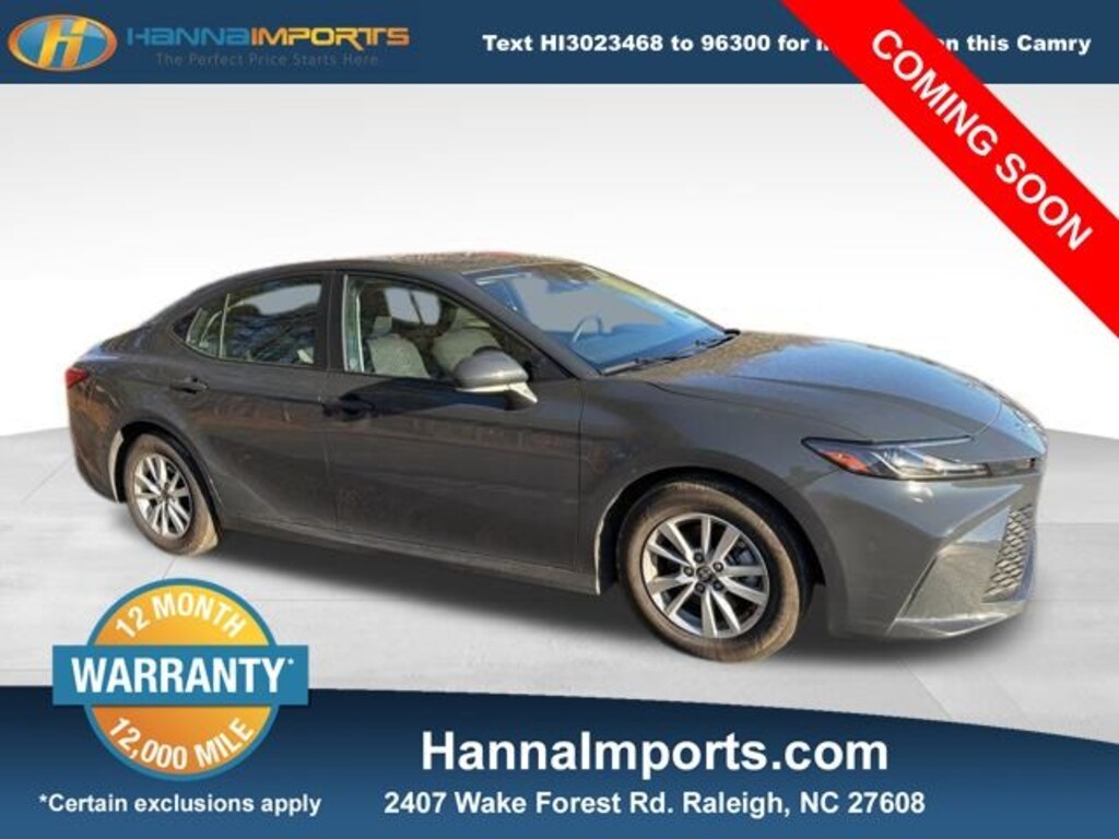 Why shop with Hanna Imports? We specialize in hand-selecting top-quality used cars, trucks, and SUVs for drivers across Raleigh, Durham, Cary, Chapel Hill, and the greater Triangle area of North Carolina. Our massive selection of 1,000+ vehicles on our Raleigh lot is carefully curated to include the most sought-after models, all priced below market value. We believe in transparency and efficiencyâ"our vehicles are aggressively priced from the start, which means no haggling, no hassle, and no wasted time. The price you see is our absolute best price. Whether you're coming from Wake Forest, Apex, Garner, or anywhere in central NC, weâre committed to making your car-buying experience smooth, affordable, and enjoyable. Come see why Hanna Imports is one of the most trusted used car dealerships in North Carolina! Used Toyota Camry in Raleigh. Used Toyota Camry in North Carolina, Camry LE, 2.5L 4-Cylinder 16V DOHC, Black w/Fabric Seat Trim, Apple CarPlay/Android Auto, Exterior Parking Camera Rear, Remote keyless entry, 4-Wheel Disc Brakes, 6 Speakers, ABS brakes, Air Conditioning, Alloy wheels, AM/FM radio: SiriusXM, Auto High-beam Headlights, Automatic temperature control, Brake assist, Bumpers: body-color, Delay-off headlights, Driver door bin, Driver vanity mirror, Dual front impact airbags, Dual front side impact airbags, Electronic Stability Control, Emergency communication system: Safety Connect (up to 10-year trial subscription), Fabric Seat Trim, Four wheel independent suspension, Front anti-roll bar, Front Bucket Seats, Front Center Armrest, Front dual zone A/C, Front reading lights, Fully automatic headlights, Heated door mirrors, Illuminated entry, Knee airbag, Low tire pressure warning, Occupant sensing airbag, Outside temperature display, Overhead airbag, Overhead console, Panic alarm, Passenger door bin, Passenger vanity mirror, Power door mirrors, Power steering, Power windows, Radio data system, Radio: Toyota Audio Multimedia w/8" Touchscreen, Rear anti-roll bar, Rear seat center armrest, Rear side impact airbag, Rear window defroster, Security system, Speed control, Speed-sensing steering, Split folding rear seat, Steering wheel mounted audio controls, Telescoping steering wheel, Tilt steering wheel, Traction control, Trip computer, Turn signal indicator mirrors, Variably intermittent wipers, and Wheels: 16" Silver-Finished Alloy.
