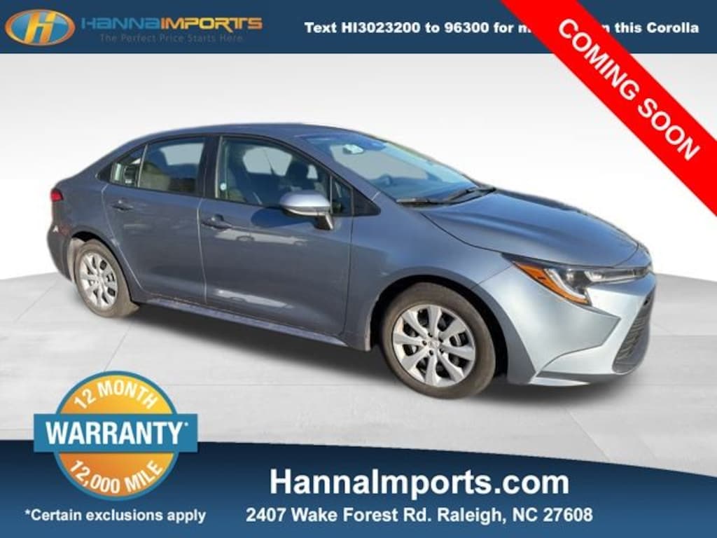 Why shop with Hanna Imports? We specialize in hand-selecting top-quality used cars, trucks, and SUVs for drivers across Raleigh, Durham, Cary, Chapel Hill, and the greater Triangle area of North Carolina. Our massive selection of 1,000+ vehicles on our Raleigh lot is carefully curated to include the most sought-after models, all priced below market value. We believe in transparency and efficiencyâ"our vehicles are aggressively priced from the start, which means no haggling, no hassle, and no wasted time. The price you see is our absolute best price. Whether you're coming from Wake Forest, Apex, Garner, or anywhere in central NC, weâre committed to making your car-buying experience smooth, affordable, and enjoyable. Come see why Hanna Imports is one of the most trusted used car dealerships in North Carolina! Used Toyota Corolla in Raleigh. Used Toyota Corolla in North Carolina, Corolla LE, Apple CarPlay/Android Auto, Exterior Parking Camera Rear, 16" Steel Wheels w/Covers, 4-Wheel Disc Brakes, 6 Speakers, ABS brakes, Air Conditioning, AM/FM radio: SiriusXM, Auto High-beam Headlights, Automatic temperature control, Brake assist, Bumpers: body-color, Delay-off headlights, Driver door bin, Driver vanity mirror, Dual front impact airbags, Dual front side impact airbags, Electronic Stability Control, Emergency communication system: Safety Connect (up to 10-year trial subscription), Fabric Seat Trim, Front anti-roll bar, Front Bucket Seats, Front Center Armrest, Front reading lights, Front wheel independent suspension, Fully automatic headlights, Illuminated entry, Knee airbag, Low tire pressure warning, Occupant sensing airbag, Outside temperature display, Overhead airbag, Panic alarm, Passenger door bin, Passenger vanity mirror, Power door mirrors, Power steering, Power windows, Radio data system, Radio: 8" Toyota Audio Multimedia, Rear anti-roll bar, Rear seat center armrest, Rear side impact airbag, Rear window defroster, Remote keyless entry, Speed control, Split folding rear seat, Steering wheel mounted audio controls, Tachometer, Telescoping steering wheel, Tilt steering wheel, Traction control, and Trip computer.