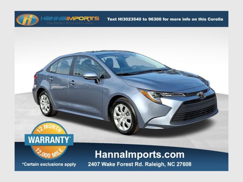 Why shop with Hanna Imports? We specialize in hand-selecting top-quality used cars, trucks, and SUVs for drivers across Raleigh, Durham, Cary, Chapel Hill, and the greater Triangle area of North Carolina. Our massive selection of 1,000+ vehicles on our Raleigh lot is carefully curated to include the most sought-after models, all priced below market value. We believe in transparency and efficiencyâ"our vehicles are aggressively priced from the start, which means no haggling, no hassle, and no wasted time. The price you see is our absolute best price. Whether you're coming from Wake Forest, Apex, Garner, or anywhere in central NC, weâre committed to making your car-buying experience smooth, affordable, and enjoyable. Come see why Hanna Imports is one of the most trusted used car dealerships in North Carolina! Used Toyota Corolla in Raleigh. Used Toyota Corolla in North Carolina, Corolla LE, Exterior Parking Camera Rear, Remote keyless entry, 4-Wheel Disc Brakes, 6 Speakers, ABS brakes, Air Conditioning, AM/FM radio: SiriusXM, Apple CarPlay/Android Auto, Auto High-beam Headlights, Automatic temperature control, Brake assist, Bumpers: body-color, Delay-off headlights, Driver door bin, Driver vanity mirror, Dual front impact airbags, Dual front side impact airbags, Electronic Stability Control, Emergency communication system: Safety Connect (up to 10-year trial subscription), Fabric Seat Trim, Front anti-roll bar, Front Bucket Seats, Front Center Armrest, Front reading lights, Front wheel independent suspension, Fully automatic headlights, Illuminated entry, Knee airbag, Low tire pressure warning, Occupant sensing airbag, Outside temperature display, Overhead airbag, Panic alarm, Passenger door bin, Passenger vanity mirror, Power door mirrors, Power steering, Power windows, Radio data system, Radio: 8" Toyota Audio Multimedia, Rear anti-roll bar, Rear seat center armrest, Rear side impact airbag, Rear window defroster, Speed control, Split folding rear seat, Steering wheel mounted audio controls, Tachometer, Telescoping steering wheel, Tilt steering wheel, Traction control, Trip computer, and Wheels: 16" Steel with Covers.