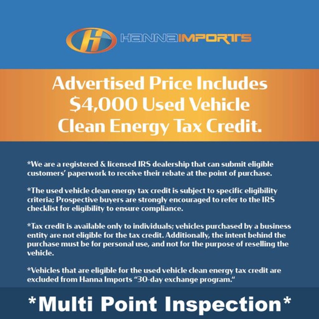 CARFAX One-Owner. *Advertised Price includes Tax Credit of 30% off the sale price, up to $4000 off. See IRS.gov*, *We are a registered IRS dealership so qualified customers can receive rebate at time of purchase., *Tax credit is available only to individuals; vehicles purchased by a business are ineligible., *Vehicles eligible for tax credit are excluded from Hanna Imports â30-day exchange program.", *The tax credit is subject to specific eligibility criteria, and not all buyers will qualify., *Please consult the IRS guidelines and verify your eligibility before making a purchase decision., Carfax Accident Free, *Multi Point Inspection*, Alloy wheels, Apple CarPlay/Android Auto, Automatic temperature control, Front dual zone A/C, Fully automatic headlights, Heads-Up Display, Heated door mirrors, Heated front seats, Heated rear seats, Navigation System, Power door mirrors, Power driver seat, Power Liftgate, Power moonroof: Panoramic, Remote keyless entry, Security system, Ventilated front seats, Ventilated rear seats.