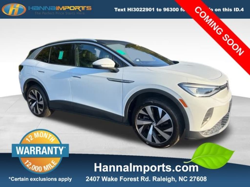 Why shop with Hanna Imports? We specialize in hand-selecting top-quality used cars, trucks, and SUVs for drivers across Raleigh, Durham, Cary, Chapel Hill, and the greater Triangle area of North Carolina. Our massive selection of 1,000+ vehicles on our Raleigh lot is carefully curated to include the most sought-after models, all priced below market value. We believe in transparency and efficiencyâ"our vehicles are aggressively priced from the start, which means no haggling, no hassle, and no wasted time. The price you see is our absolute best price. Whether you're coming from Wake Forest, Apex, Garner, or anywhere in central NC, weâre committed to making your car-buying experience smooth, affordable, and enjoyable. Come see why Hanna Imports is one of the most trusted used car dealerships in North Carolina! Used Volkswagen ID.4 in Raleigh. Used Volkswagen ID.4 in North Carolina, Gradient Package (Black Roof, Silver Accents on Front & Rear Bumpers, and Wheels: 20" Dynamic Design Machined Alloy), ID.4 Pro S, AWD, Exterior Parking Camera Rear, Front Bucket Seats, Fully automatic headlights, Heated Front Seats, Heated steering wheel, Navigation System, Perforated V-Tex Leatherette Seating Surfaces, Power Liftgate, Radio: Discover Pro Max w/12" Touchscreen Nav, Remote keyless entry, Roof rack: rails only, 3.90 Axle Ratio, 4 Wheel Independent Suspension, 7 Speakers, ABS brakes, Air Conditioning, Alloy wheels, Auto High-beam Headlights, Auto-dimming Rear-View mirror, Auto-Dimming Rearview Mirror w/Homelink, Automatic temperature control, Brake assist, Bumpers: body-color, Delay-off headlights, Driver door bin, Driver vanity mirror, Driver's Seat Mounted Armrest, Dual front impact airbags, Dual front side impact airbags, Electronic Stability Control, Emergency communication system: VW Car-Net services (capabilities require enrollment or subscription), Four wheel independent suspension, Front anti-roll bar, Front dual zone A/C, Front fog lights, Front reading lights, Heated door mirrors, Heated front seats, Illuminated entry, Low tire pressure warning, Memory seat, Occupant sensing airbag, Outside temperature display, Overhead airbag, Overhead console, Panic alarm, Passenger door bin, Passenger seat mounted armrest, Passenger vanity mirror, Power door mirrors, Power driver seat, Power passenger seat, Power steering, Power windows, Radio data system, Rain sensing wipers, Rear anti-roll bar, Rear reading lights, Rear seat center armrest, Rear window defroster, Rear window wiper, Speed control, Speed-sensing steering, Split folding rear seat, Spoiler, Steering wheel mounted audio controls, Telescoping steering wheel, Tilt steering wheel, Traction control, Trip computer, Turn signal indicator mirrors, Variably intermittent wipers, and Wheels: 19" 5-Spoke 2-Tone Machined Alloy.