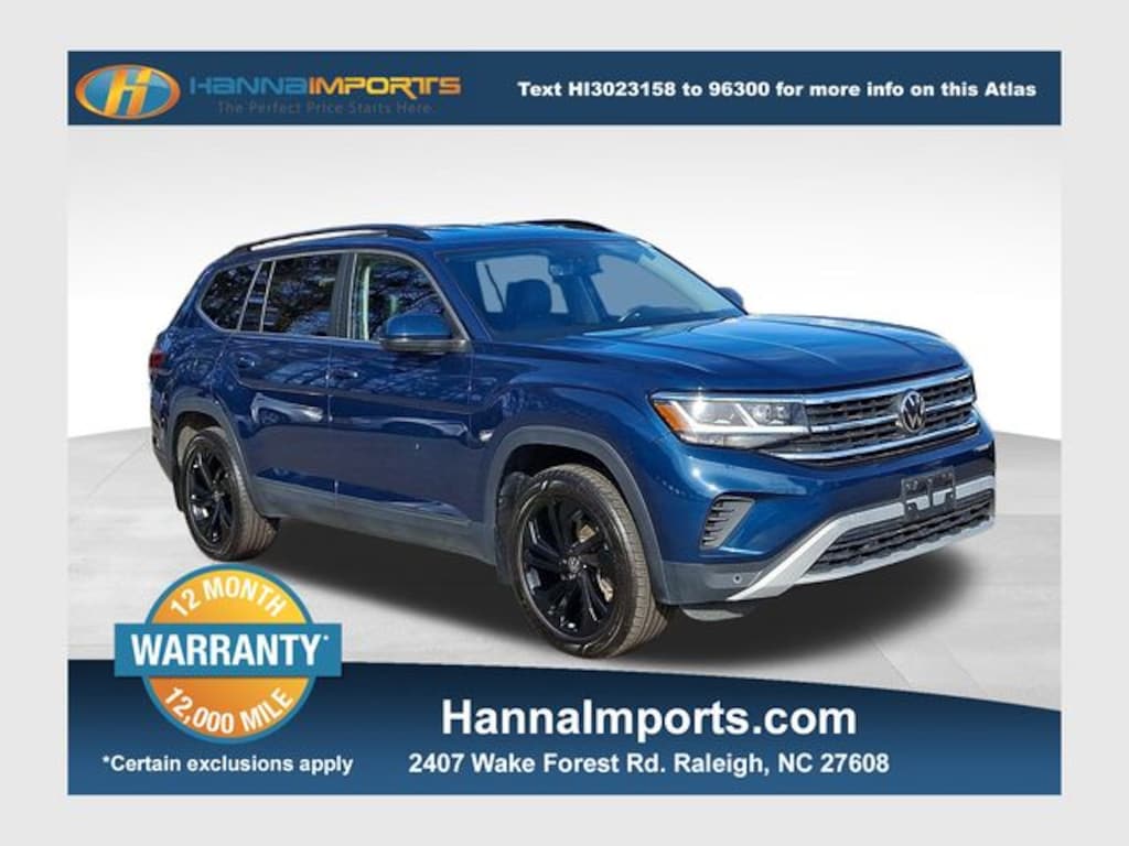 Why shop with Hanna Imports? We specialize in hand-selecting top-quality used cars, trucks, and SUVs for drivers across Raleigh, Durham, Cary, Chapel Hill, and the greater Triangle area of North Carolina. Our massive selection of 1,000+ vehicles on our Raleigh lot is carefully curated to include the most sought-after models, all priced below market value. We believe in transparency and efficiencyâ"our vehicles are aggressively priced from the start, which means no haggling, no hassle, and no wasted time. The price you see is our absolute best price. Whether you're coming from Wake Forest, Apex, Garner, or anywhere in central NC, weâre committed to making your car-buying experience smooth, affordable, and enjoyable. Come see why Hanna Imports is one of the most trusted used car dealerships in North Carolina! Used Volkswagen Atlas in Raleigh. Used Volkswagen Atlas in North Carolina, Black Wheel Package (Wheels: 20" x 8J 5-Spoke Black Painted Alloy), Atlas 3.6L V6 SE w/Technology, AWD, Exterior Parking Camera Rear, Heated front seats, Power Liftgate, Remote keyless entry, Steering wheel mounted audio controls, 3.60 Axle Ratio, 3rd row seats: split-bench, 4-Wheel Disc Brakes, 6 Speakers, ABS brakes, Air Conditioning, Alloy wheels, AM/FM radio: SiriusXM with 360L, Auto-Dimming Rear-View Mirror, Auto-dimming Rear-View mirror, Automatic temperature control, Brake assist, Bumpers: body-color, Compass, Delay-off headlights, Driver door bin, Driver vanity mirror, Dual front impact airbags, Dual front side impact airbags, Electronic Stability Control, Emergency communication system: VW Car-Net Safe & Secure 5-year, First Aid Kit, Four wheel independent suspension, Front anti-roll bar, Front Bucket Seats, Front Center Armrest, Front dual zone A/C, Front fog lights, Front reading lights, Fully automatic headlights, Heated Comfort Front Bucket Seats, Heated door mirrors, Heavy Duty Trunk Liner w/VW CarGo Blocks, Illuminated entry, Leather Shift Knob, Low tire pressure warning, Occupant sensing airbag, Outside temperature display, Overhead airbag, Overhead console, Panic alarm, Passenger door bin, Passenger vanity mirror, Perforated V-Tex Leatherette Seating Surfaces, Power door mirrors, Power driver seat, Power steering, Power windows, Privacy Cover, Radio data system, Radio: MIB3 Composition Media w/8" Touchscreen, Rain sensing wipers, Rear air conditioning, Rear anti-roll bar, Rear reading lights, Rear seat center armrest, Rear window defroster, Rear window wiper, Roadside Assistance Kit, Rubber Mats Kit - Bench Seats, Security system, Speed control, Speed-sensing steering, Split folding rear seat, Spoiler, Standard Suspension, Tachometer, Telescoping steering wheel, Tilt steering wheel, Traction control, Trip computer, Turn signal indicator mirrors, Variably intermittent wipers, and Wheels: 20" x 8J 5-Spoke Silver Painted Alloy.