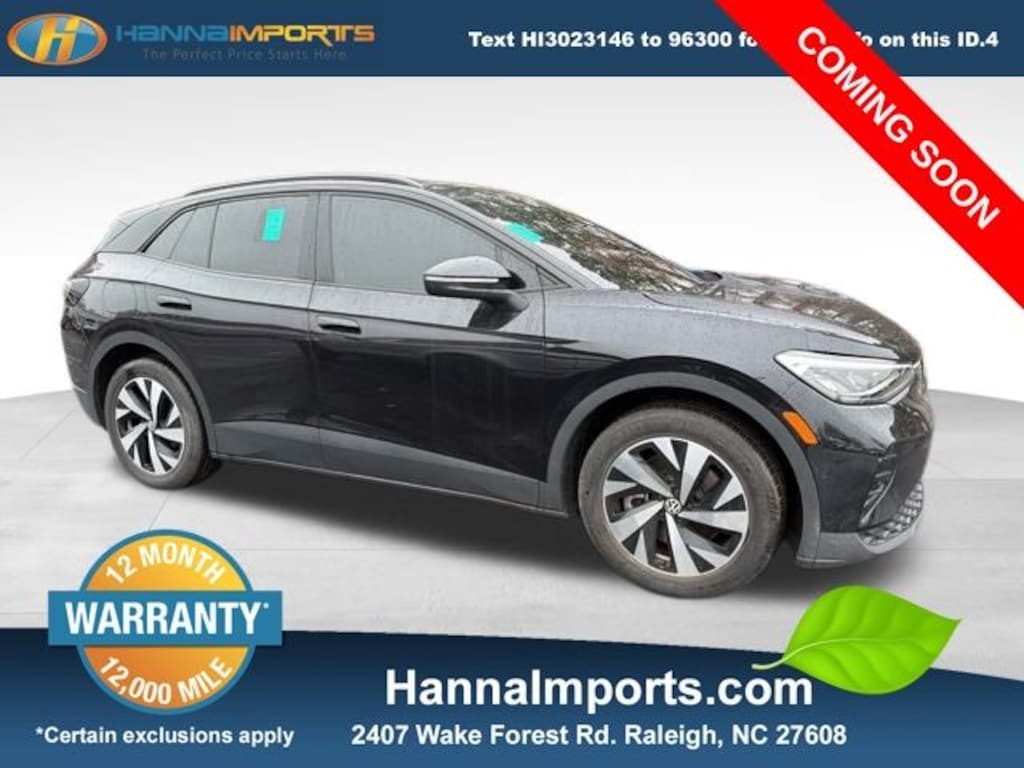 Why shop with Hanna Imports? We specialize in hand-selecting top-quality used cars, trucks, and SUVs for drivers across Raleigh, Durham, Cary, Chapel Hill, and the greater Triangle area of North Carolina. Our massive selection of 1,000+ vehicles on our Raleigh lot is carefully curated to include the most sought-after models, all priced below market value. We believe in transparency and efficiencyâ"our vehicles are aggressively priced from the start, which means no haggling, no hassle, and no wasted time. The price you see is our absolute best price. Whether you're coming from Wake Forest, Apex, Garner, or anywhere in central NC, weâre committed to making your car-buying experience smooth, affordable, and enjoyable. Come see why Hanna Imports is one of the most trusted used car dealerships in North Carolina! Used Volkswagen ID.4 in Raleigh. Used Volkswagen ID.4 in North Carolina, Exterior Parking Camera Rear, Heated Front Seats, Navigation System, Remote keyless entry, 4-Wheel Independent Suspension, 4.39 Axle Ratio, 7 Speakers, ABS brakes, Air Conditioning, Alloy wheels, Auto High-beam Headlights, Auto-dimming Rear-View mirror, Automatic temperature control, Brake assist, Bumpers: body-color, Cloth Seating Surfaces, Delay-off headlights, Driver door bin, Driver vanity mirror, Driver's Seat Mounted Armrest, Dual front impact airbags, Dual front side impact airbags, Electronic Stability Control, Emergency communication system: VW Car-Net Safe & Secure 5-year, Four wheel independent suspension, Front anti-roll bar, Front Bucket Seats, Front dual zone A/C, Front reading lights, Fully automatic headlights, Heated door mirrors, Heated front seats, Heavy Duty Trunk Liner w/VW CarGo Blocks, Illuminated entry, Low tire pressure warning, Occupant sensing airbag, Outside temperature display, Overhead airbag, Overhead console, Panic alarm, Passenger door bin, Passenger seat mounted armrest, Passenger vanity mirror, Power door mirrors, Power steering, Power windows, Radio data system, Radio: Discover Pro Max w/Touchscreen Navigation, Rain sensing wipers, Rear anti-roll bar, Rear reading lights, Rear window defroster, Rear window wiper, Rubber Mats Kit, Speed control, Speed-sensing steering, Split folding rear seat, Spoiler, Steering wheel mounted audio controls, Telescoping steering wheel, Tilt steering wheel, Traction control, Trip computer, Turn signal indicator mirrors, Variably intermittent wipers, and Wheels: 19" 2-Tone Machined Alloy.