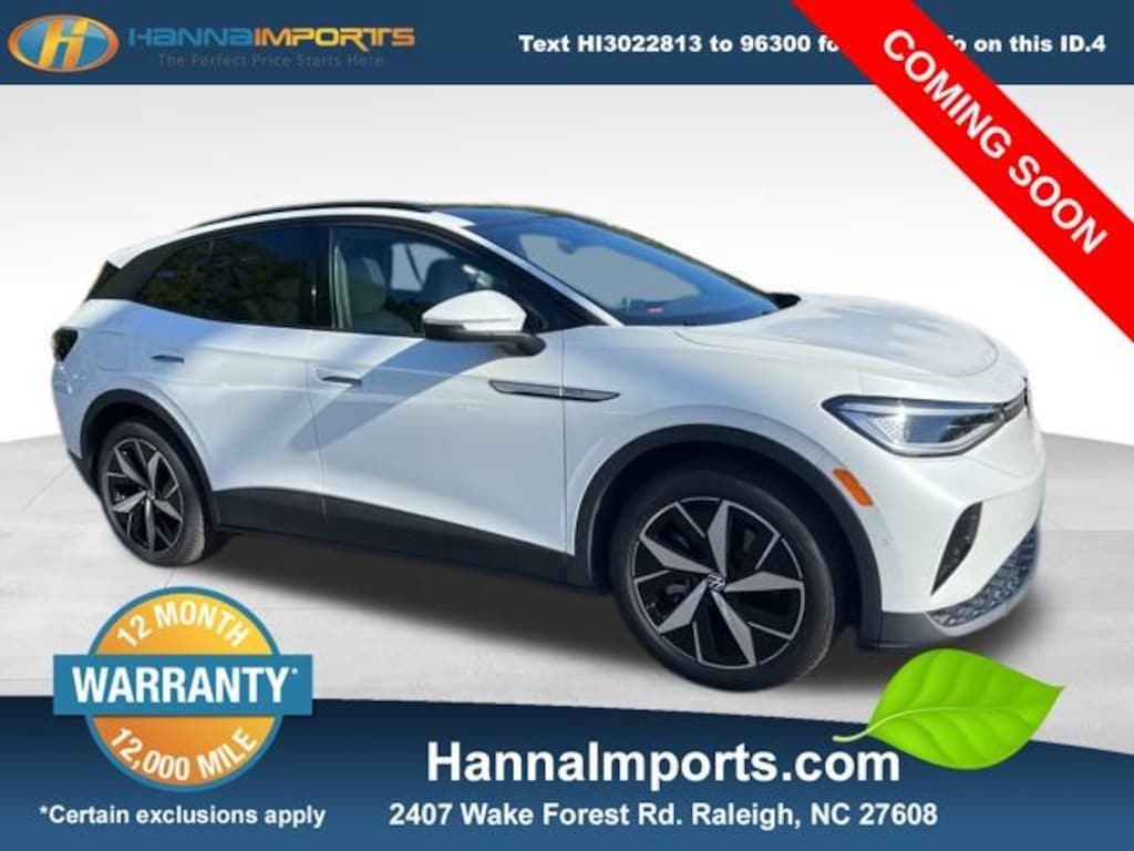 Why shop with Hanna Imports? We specialize in hand-selecting top-quality used cars, trucks, and SUVs for drivers across Raleigh, Durham, Cary, Chapel Hill, and the greater Triangle area of North Carolina. Our massive selection of 1,000+ vehicles on our Raleigh lot is carefully curated to include the most sought-after models, all priced below market value. We believe in transparency and efficiencyâ"our vehicles are aggressively priced from the start, which means no haggling, no hassle, and no wasted time. The price you see is our absolute best price. Whether you're coming from Wake Forest, Apex, Garner, or anywhere in central NC, weâre committed to making your car-buying experience smooth, affordable, and enjoyable. Come see why Hanna Imports is one of the most trusted used car dealerships in North Carolina! Used Volkswagen ID.4 in Raleigh. Used Volkswagen ID.4 in North Carolina, ID.4 Pro S, Exterior Parking Camera Rear, Heated front seats, Navigation System, Power Liftgate, Remote keyless entry, 4-Wheel Independent Suspension, 4.39 Axle Ratio, 7 Speakers, ABS brakes, Air Conditioning, Alloy wheels, Auto High-beam Headlights, Auto-dimming Rear-View mirror, Automatic temperature control, Brake assist, Bumpers: body-color, Delay-off headlights, Driver door bin, Driver vanity mirror, Driver's Seat Mounted Armrest, Dual front impact airbags, Dual front side impact airbags, Electronic Stability Control, Emergency communication system: VW Car-Net Safe & Secure 5-year, Four wheel independent suspension, Front anti-roll bar, Front Bucket Seats, Front dual zone A/C, Front fog lights, Front reading lights, Fully automatic headlights, Heated & Actively Ventilated Front Seats, Heated door mirrors, Heated steering wheel, Illuminated entry, Low tire pressure warning, Memory seat, Occupant sensing airbag, Outside temperature display, Overhead airbag, Overhead console, Panic alarm, Passenger door bin, Passenger seat mounted armrest, Passenger vanity mirror, Perforated V-Tex Leatherette Seating Surfaces, Power door mirrors, Power driver seat, Power passenger seat, Power steering, Power windows, Radio data system, Radio: Discover Pro Max w/Touchscreen Navigation, Rain sensing wipers, Rear anti-roll bar, Rear reading lights, Rear seat center armrest, Rear window defroster, Rear window wiper, Speed control, Speed-sensing steering, Split folding rear seat, Spoiler, Steering wheel mounted audio controls, Telescoping steering wheel, Tilt steering wheel, Traction control, Trip computer, Turn signal indicator mirrors, Variably intermittent wipers, Ventilated front seats, and Wheels: 20" 5-Spoke 2-Tone Machined Alloy.