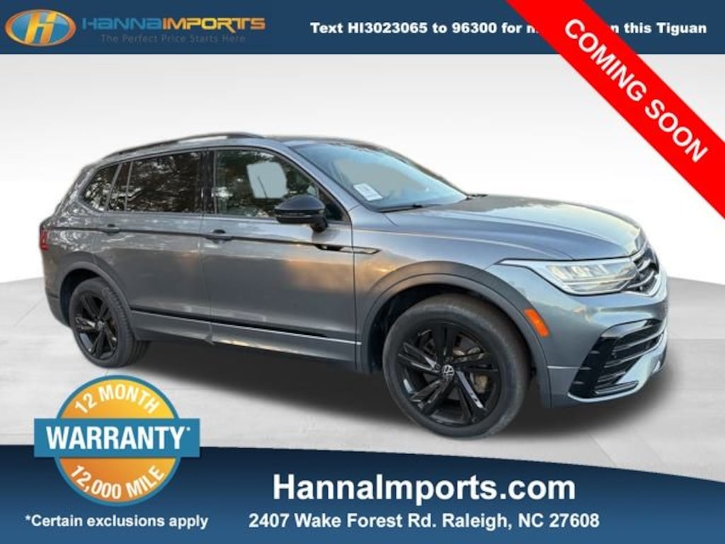 Why shop with Hanna Imports? We specialize in hand-selecting top-quality used cars, trucks, and SUVs for drivers across Raleigh, Durham, Cary, Chapel Hill, and the greater Triangle area of North Carolina. Our massive selection of 1,000+ vehicles on our Raleigh lot is carefully curated to include the most sought-after models, all priced below market value. We believe in transparency and efficiencyâ"our vehicles are aggressively priced from the start, which means no haggling, no hassle, and no wasted time. The price you see is our absolute best price. Whether you're coming from Wake Forest, Apex, Garner, or anywhere in central NC, weâre committed to making your car-buying experience smooth, affordable, and enjoyable. Come see why Hanna Imports is one of the most trusted used car dealerships in North Carolina! Used Volkswagen Tiguan in Raleigh. Used Volkswagen Tiguan in North Carolina, Tiguan 2.0T SE R-Line Black, 3rd row seats: bench, Exterior Parking Camera Rear, Heated front seats, Power Liftgate, Power moonroof, Remote keyless entry, 3-Row Rubber Monster Mats Kit (Set of 5), 3.33 Axle Ratio, 4-Wheel Disc Brakes, 4-Wheel Independent Suspension, 6 Speakers, ABS brakes, Air Conditioning, Alloy wheels, AM/FM radio: SiriusXM with 360L, Auto-dimming Rear-View mirror, Auto-Dimming Rearview Mirror w/HomeLink Connect, Automatic temperature control, Brake assist, Bumpers: body-color, Cargo Area Retractable Privacy Cover, Compass, Delay-off headlights, Driver door bin, Driver vanity mirror, Dual front impact airbags, Dual front side impact airbags, Electronic Stability Control, Emergency communication system: VW Car-Net Safe & Secure 5-year, First Aid Kit, Four wheel independent suspension, Front anti-roll bar, Front Bucket Seats, Front Center Armrest, Front dual zone A/C, Front reading lights, Fully automatic headlights, Heated door mirrors, Heated Front Seats, Heavy Duty Trunk Liner w/VW CarGo Blocks, Illuminated entry, Leather Shift Knob, Leather steering wheel, Low tire pressure warning, Occupant sensing airbag, Outside temperature display, Overhead airbag, Overhead console, Panic alarm, Passenger door bin, Passenger vanity mirror, Perforated V-Tex Leatherette Seating Surfaces, Power door mirrors, Power driver seat, Power steering, Power windows, Radio data system, Radio: MIB3 Composition Media AM/FM/HD, Rain sensing wipers, Rear anti-roll bar, Rear reading lights, Rear seat center armrest, Rear window defroster, Rear window wiper, Roadside Assistance Kit, Security system, Speed control, Speed-sensing steering, Split folding rear seat, Spoiler, Sport steering wheel, Steering wheel mounted audio controls, Tachometer, Telescoping steering wheel, Tilt steering wheel, Traction control, Trip computer, Turn signal indicator mirrors, Variably intermittent wipers, and Wheels: 19" Black Painted Twin 5-Spoke Alloy.