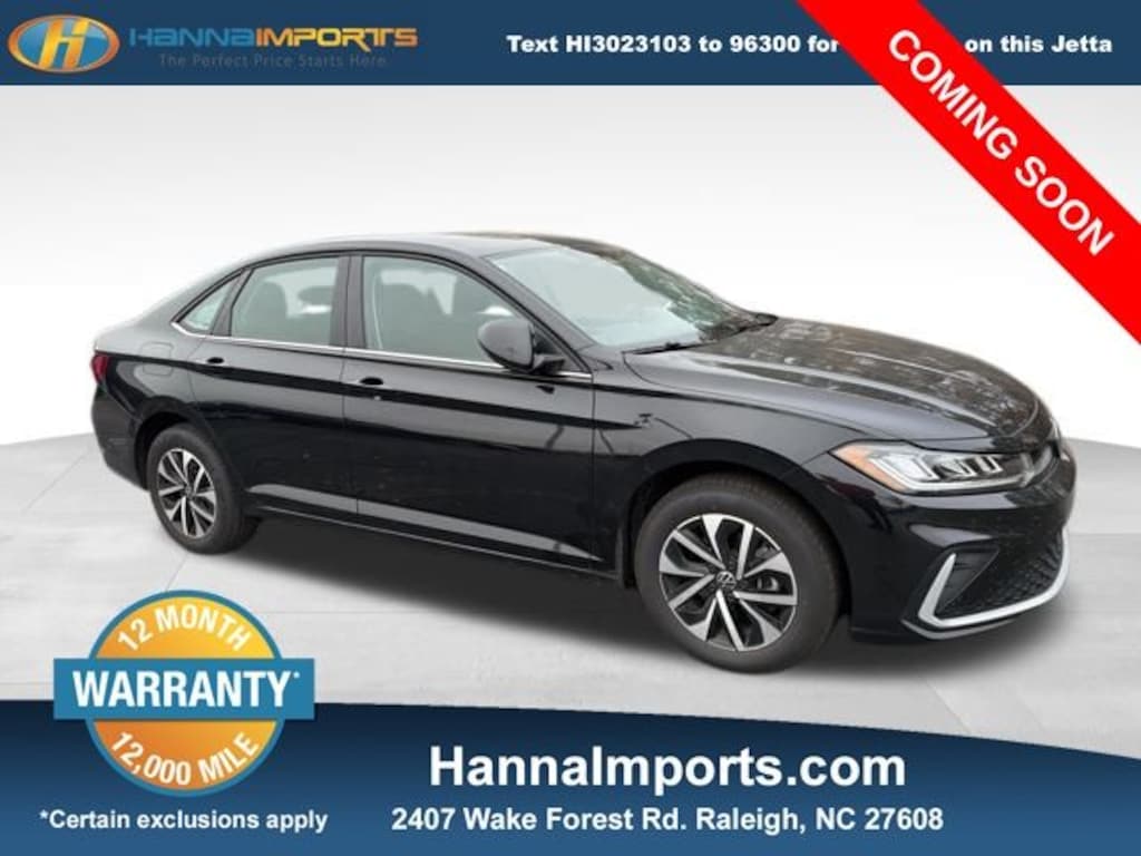 Why shop with Hanna Imports? We specialize in hand-selecting top-quality used cars, trucks, and SUVs for drivers across Raleigh, Durham, Cary, Chapel Hill, and the greater Triangle area of North Carolina. Our massive selection of 1,000+ vehicles on our Raleigh lot is carefully curated to include the most sought-after models, all priced below market value. We believe in transparency and efficiencyâ"our vehicles are aggressively priced from the start, which means no haggling, no hassle, and no wasted time. The price you see is our absolute best price. Whether you're coming from Wake Forest, Apex, Garner, or anywhere in central NC, weâre committed to making your car-buying experience smooth, affordable, and enjoyable. Come see why Hanna Imports is one of the most trusted used car dealerships in North Carolina! Used Volkswagen Jetta in Raleigh. Used Volkswagen Jetta in North Carolina, Jetta 1.5T S, Titan Black w/Cloth Seat Trim, Exterior Parking Camera Rear, Remote keyless entry, 4 Speakers, 4-Wheel Disc Brakes, ABS brakes, Active Blind Spot Monitor, Air Conditioning, Alloy wheels, Auto-dimming Rear-View mirror, Automatic temperature control, Brake assist, Bumpers: body-color, Cloth Seat Trim, Delay-off headlights, Driver door bin, Driver vanity mirror, Dual front impact airbags, Dual front side impact airbags, Electronic Stability Control, Emergency communication system: VW Car-Net Safe & Secure 5-year, Front anti-roll bar, Front Bucket Seats, Front Center Armrest, Front dual zone A/C, Front Seats, Front wheel independent suspension, Fully automatic headlights, Heated door mirrors, Illuminated entry, Leather Shift Knob, Leather steering wheel, Low tire pressure warning, Occupant sensing airbag, Outside temperature display, Overhead airbag, Overhead console, Panic alarm, Passenger door bin, Passenger vanity mirror, Power door mirrors, Power steering, Power windows, Radio data system, Radio: MIB3 Composition Color w/8" Touchscreen, Rain sensing wipers, Rear anti-roll bar, Rear reading lights, Rear window defroster, Speed control, Speed-sensing steering, Split folding rear seat, Steering wheel mounted audio controls, Tachometer, Telescoping steering wheel, Tilt steering wheel, Traction control, Trip computer, Variably intermittent wipers, and Wheels: 16" 2-Tone Machined Alloy.